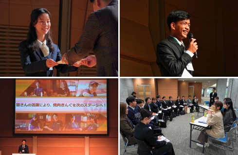本式典では、代表取締役社長の加藤央之と取締役常務執行役員の津寺毅が、「以下同文」のない一人ひとりにむけた内定証書を授与し、それぞれの自己実現を応援する激励の言葉を贈りました。また、『焼肉きんぐ』や『丸源ラーメン』をはじめとする8つの部署からブランドや事業のビジョンに関して説明するプレゼンテーションが行われ、その後各部署の先輩社員を含めた座談会を通じて、理解と交流を深め合う機会となりました。