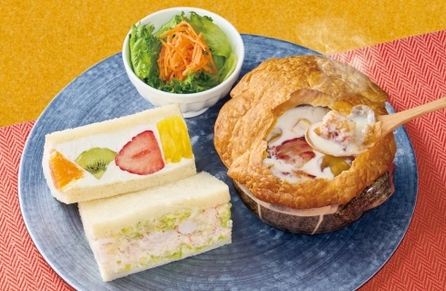 そうですね。そうして誕生したのが、フルーツパフェやフルーツサンドを楽しめる『果実屋珈琲』です。季節ごとに旬のフルーツを堪能していただけるよう、年に10回以上メニューを変更しています。サンドイッチとスープやサラダをセットにした「季節限定プレート」も好評で、3カ月に1回新メニューを発売していますね。ちょうど先月から、冬期限定のメニュー「チキンときのこのクリームスープパイ包み 選べるサンドプレート」が販売開始になりました。